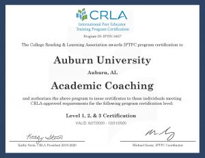 The Academic Coaching program earned College Reading & Learning Association (CRLA) International Peer Educator Training Program Certification (IPTPC) Level I in 2018 and was all three certification levels in 2020. The certification acknowledges a rigorous and comprehensive training model to prepare Academic Coaches for their work with AU students.