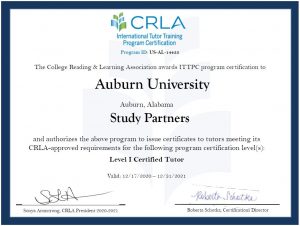 In December 2020, the Study Partners (peer tutoring) program earned the College Reading Learning Association (CRLA) certification level I for student employee (tutor) training.